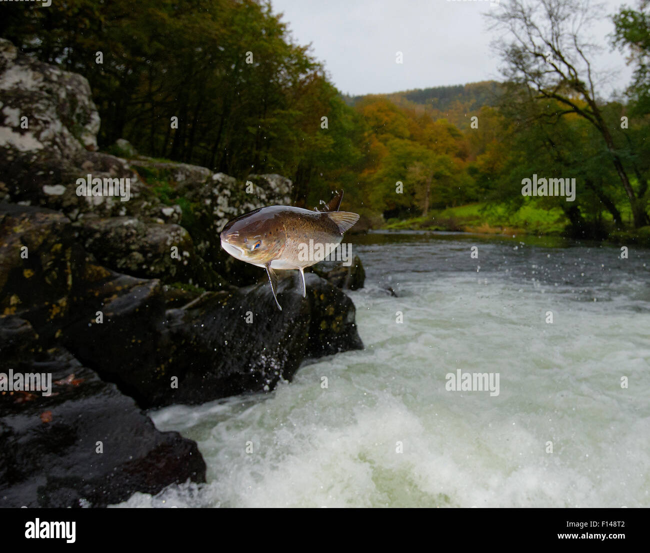 Salmon Trout Fish Salmo Sp Jumping A Waterfall On The Afon Lledr Betws Y Coed Wales October Stock Photo Alamy